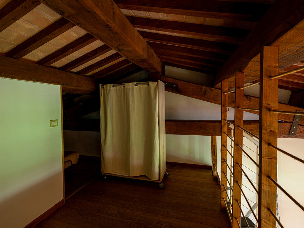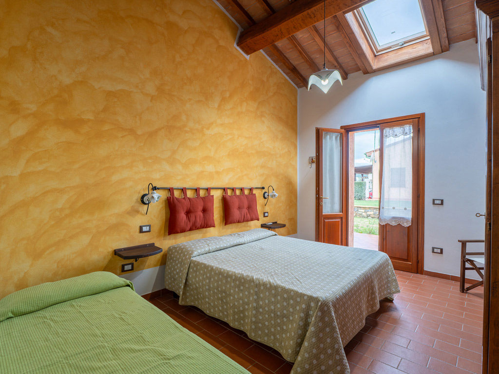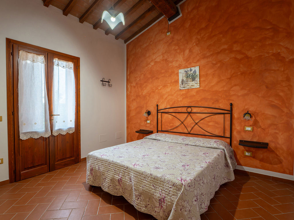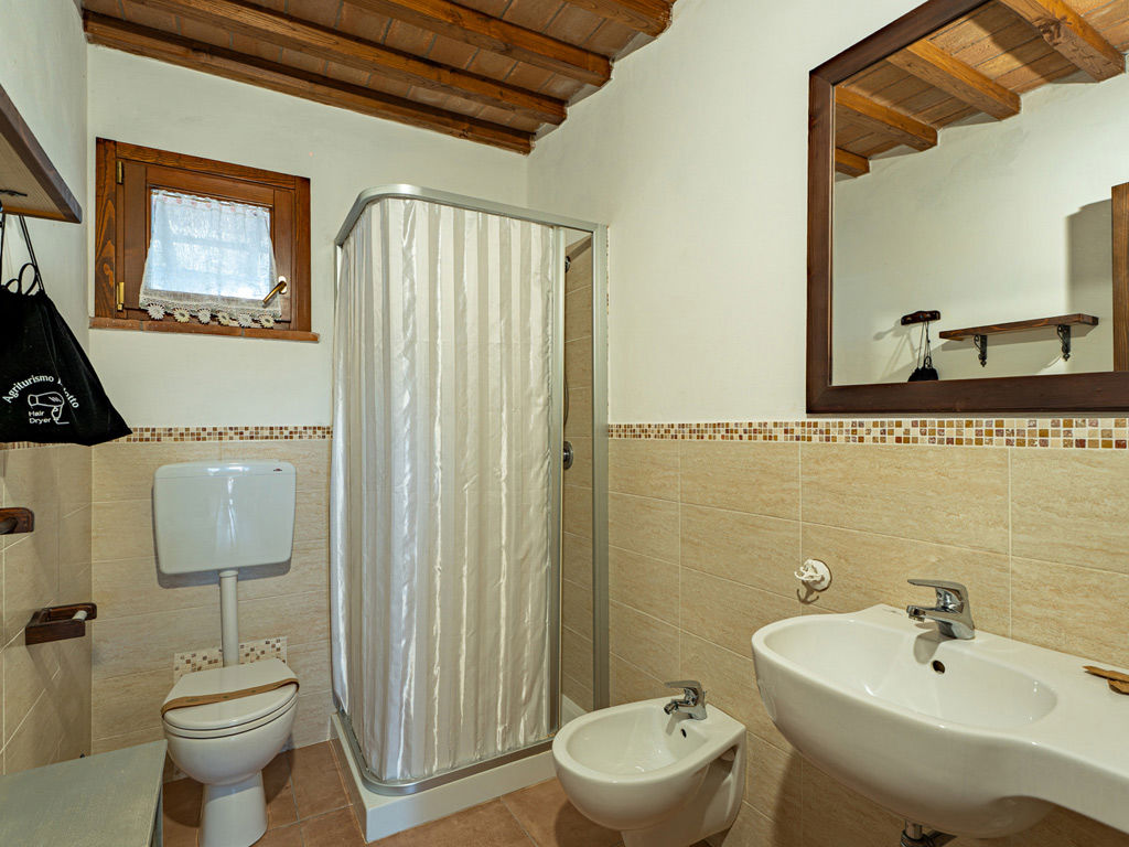 L’ingresso si apre verso l’esterno e collega l’appartamento al portico, mentre il bagno privato con doccia completa una sistemazione pratica, confortevole e perfetta per una vacanza rilassante in agriturismo.