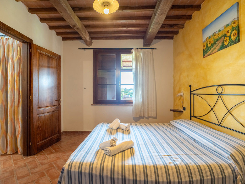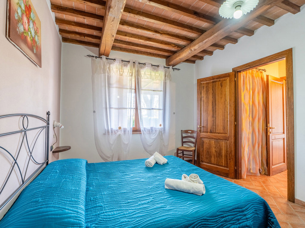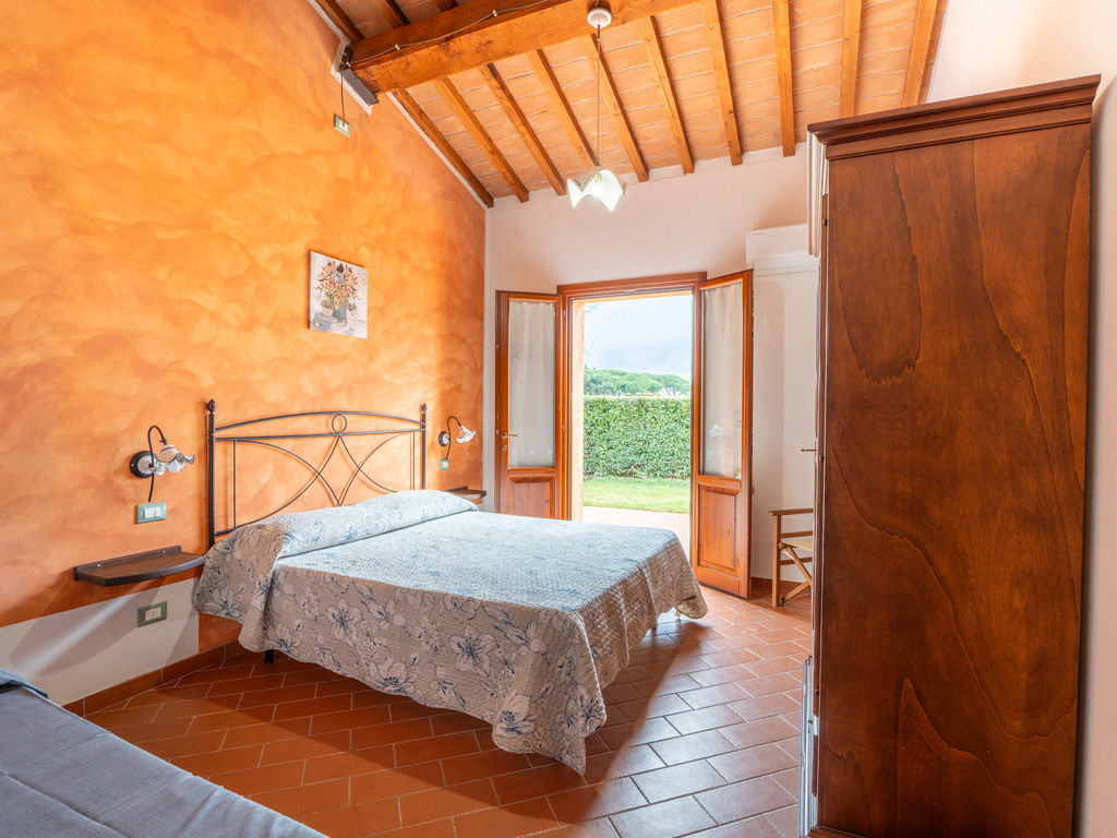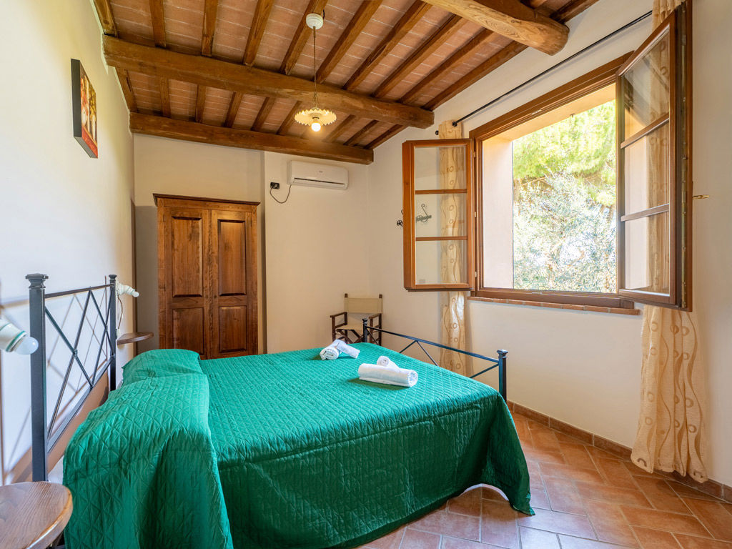 L’ingresso si apre verso l’esterno e collega l’appartamento al portico, mentre il bagno privato con doccia completa una sistemazione pratica, confortevole e perfetta per una vacanza rilassante in agriturismo.