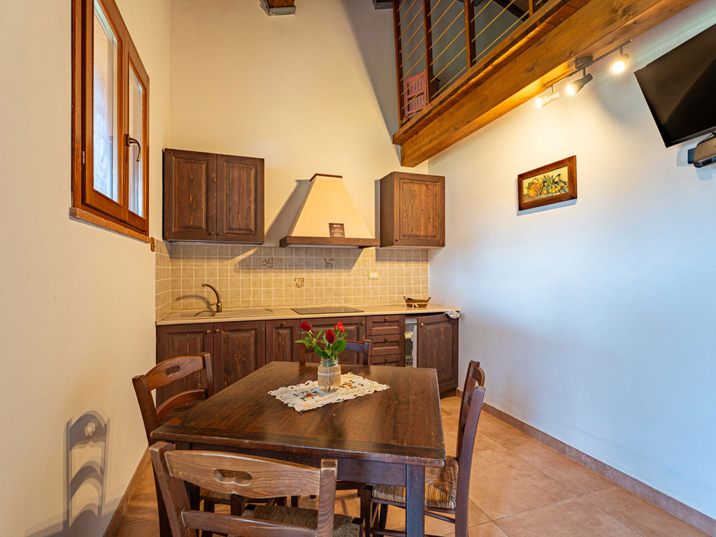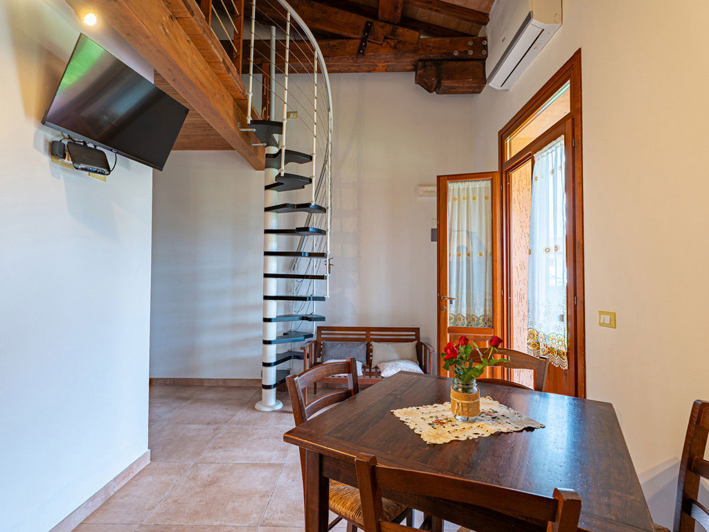 Frassino è l’appartamento ideale per chi ama ambienti raccolti ma dal carattere deciso, con uno stile autentico arricchito da un dettaglio architettonico che lo rende subito riconoscibile. La zona giorno, accogliente e luminosa, si distingue per l’angolo cottura in legno scuro, i toni caldi, le travi a vista e la scenografica scala a chiocciola, che lascia intuire uno spazio sviluppato in altezza e dona all’ambiente un’atmosfera più dinamica e originale.