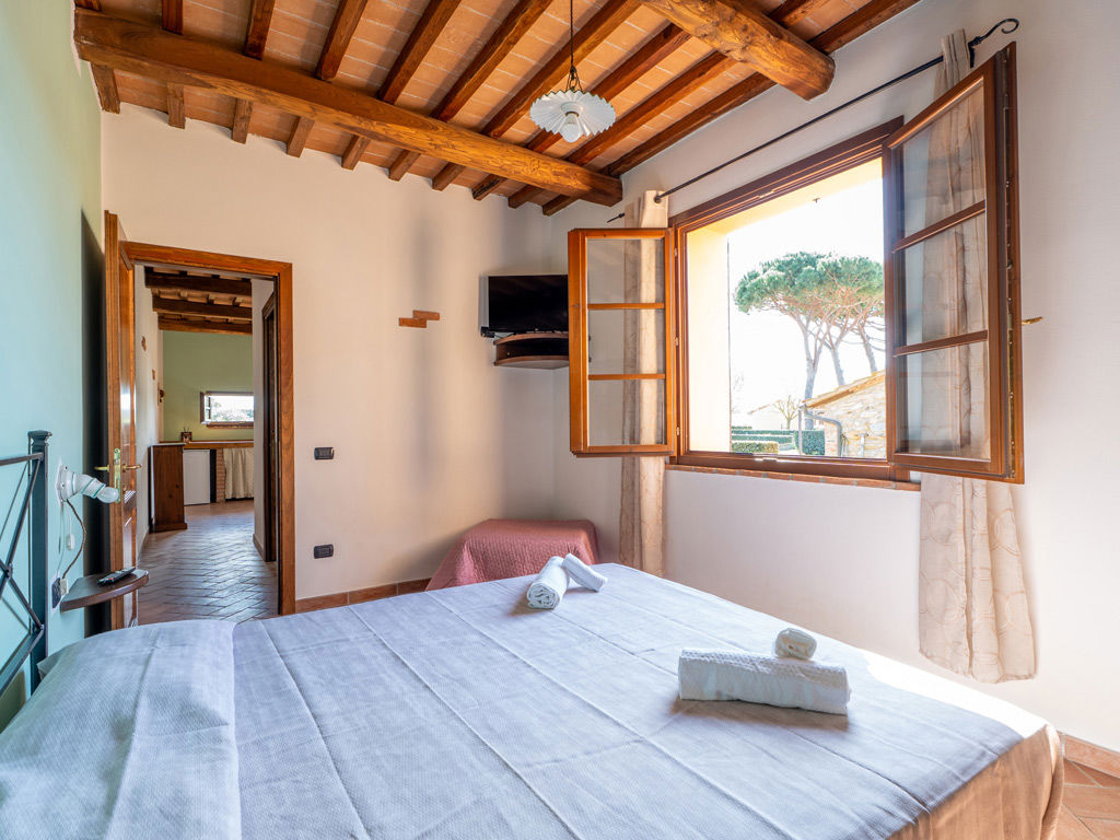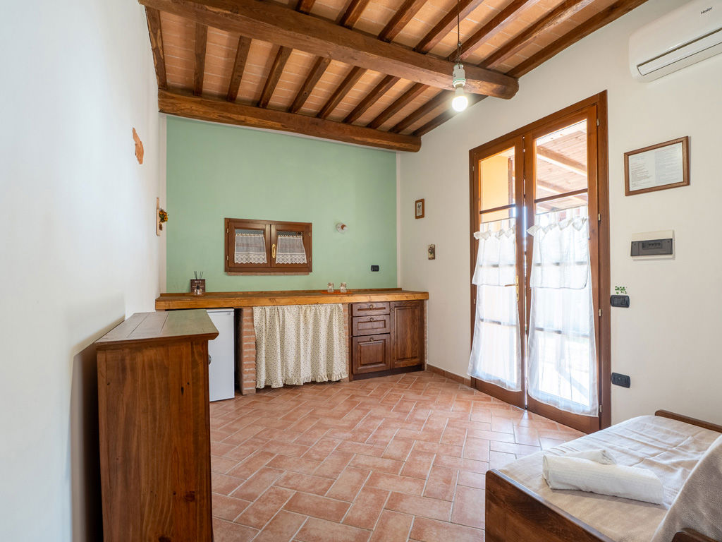 Lo stile richiama la tradizione toscana più autentica, con materiali caldi e dettagli rustici che donano carattere agli interni, mentre l’affaccio sul verde dell’agriturismo completa l’atmosfera di quiete e benessere. Una soluzione ideale per chi desidera comfort, autenticità e libertà.